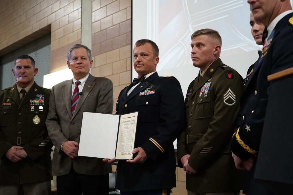 WASHINGTON, D.C. – U.S. Senator Steve Daines today attended the Montana National Guard’s Adjutant General Appreciation Dinner at Fort Harrison. At the dinner, he honored the Montana Army National Guard Aviation Crews and the Montana National Guard Family & Military Readiness Group as “Montanans of the Month” and presented them with signed copies of congressional resolutions honoring their service. Read the resolutions that were presented HERE and HERE.